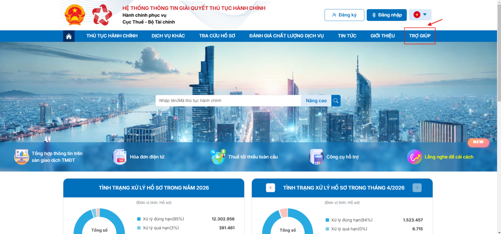 Bước 01: Truy cập vào trang Dịch Vụ Công Thuế Nhà Nước tại https://dichvucong.gdt.gov.vn chọn mục "Trợ giúp".